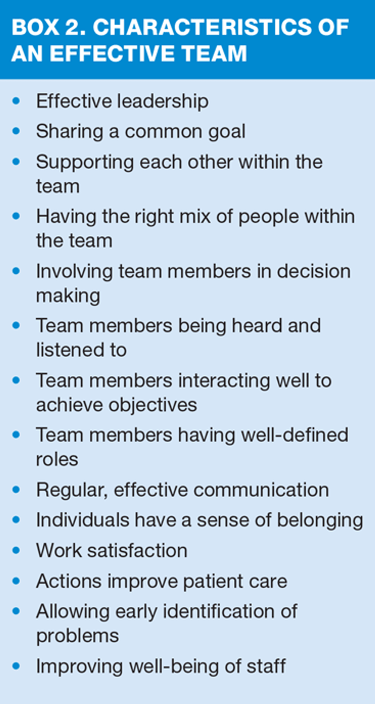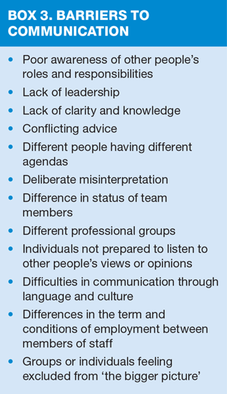 Clearly good communication between members of staff and the various practice teams is essential to the effective running of a practice in Primary Care. Effective teamwork aids performance and productivity as well as work satisfaction. Clear leadership enables more effective teamwork and results in better patient care.1 Boxes 2 and 3 highlight characteristics of both successful teamwork and ineffective communication. Barriers to communication and teamwork within the practice ultimately lead to staff feeling unsupported, creating misunderstandings, resentment and ultimately having a negative effect on patient care. The tendency to ‘crisis manage’ individual teams and situations, with no one at the helm to take responsibility within the practice, is detrimental to staff morale and productivity. Making time and looking at why communication systems don’t work within the practice will inevitably benefit everyone within the practice. However, individuals and teams all have to take on that responsibility to make it work, and be aware of each other’s roles and responsibilities. More than anything, the foundation to enable good communication to thrive within the whole practice is a unity between the GPs, to avoid contrasting and conflicting opinion, to allow everyone in the practice to work to a common goal.
