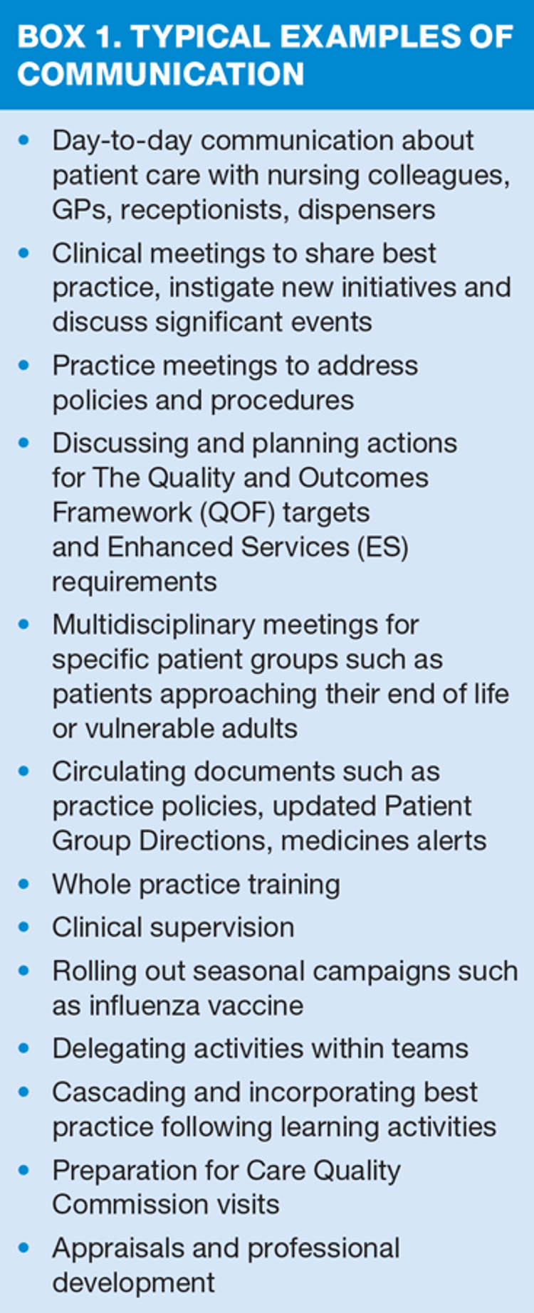 As you work through your morning list, you generate a number of items that need to be communicated to other members of the practice. You send an electronic message to the GP (there’s no disturbing them during surgery) about a patient who is having side-effects from their medication. You complete and fax through the requisite form to the District Nurses to arrange a weekend home visit while simultaneously speaking to the very same district nurse who has just popped back to the surgery. Later you quickly nip up to reception in between your appointments as you need to ask them to book hospital transport for your last patient. The receptionists are clearly rushed off their feet. You hover and try and catch one of them the moment an opportunity arises. On your way back to your room you remind yourself that you must have a conversation with the HCAs about nursing home visits which will need to be handled tactfully.