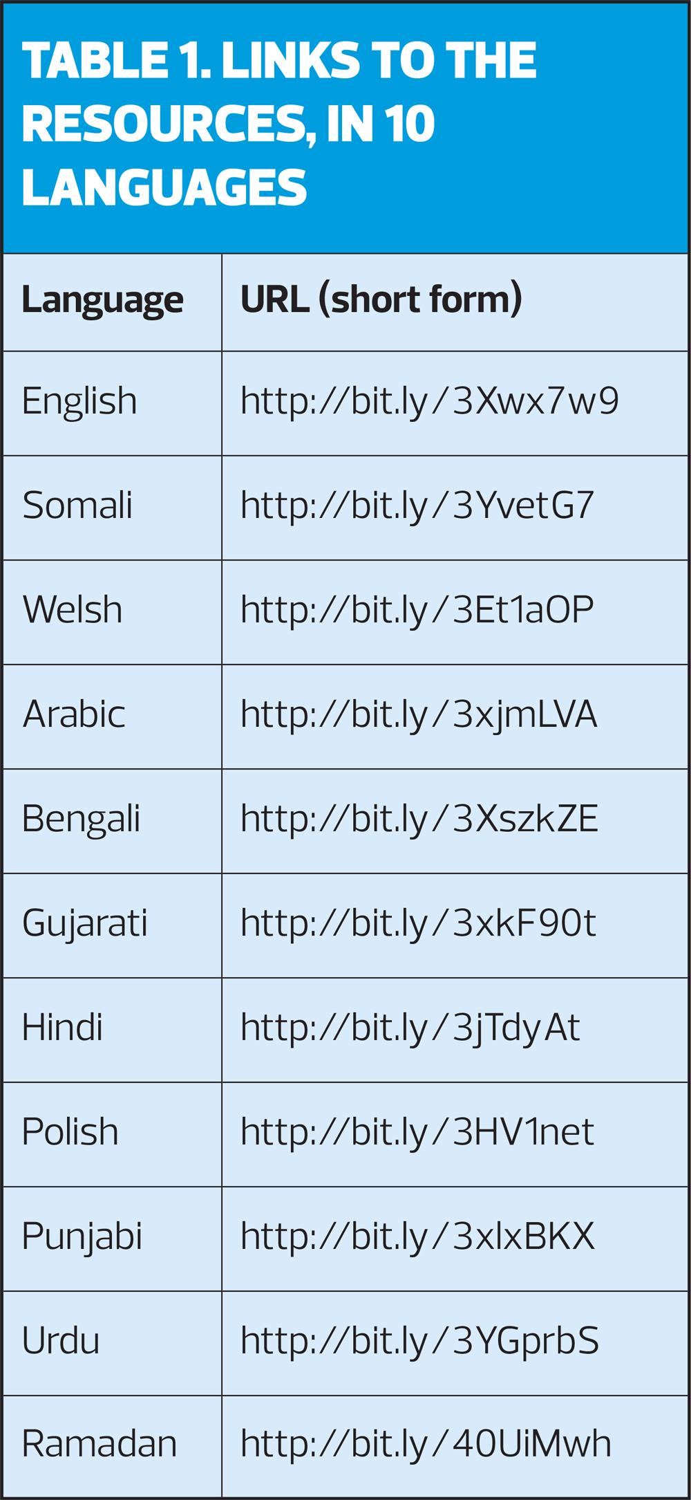 Table 1 provides links to a video on Ramadan, the use of inhaled and oral medicines and the avatars, produced in 10 different languages.