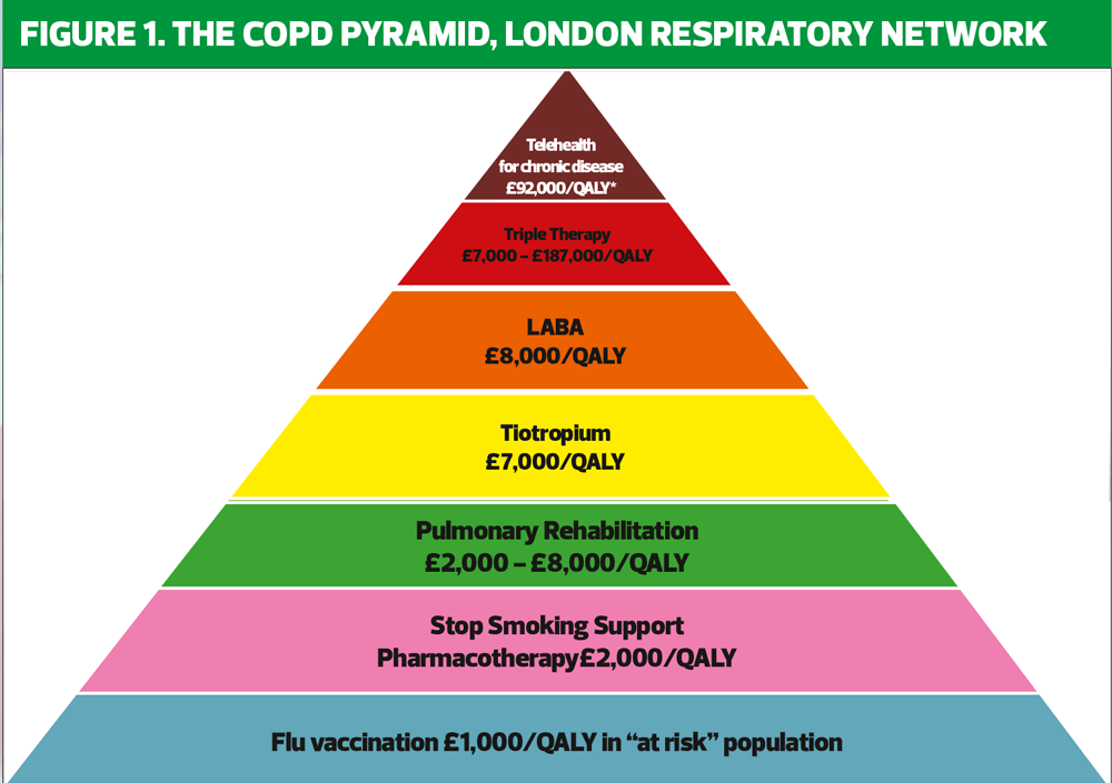 Pulmonary rehabilitation (PR) has also been shown to reduce readmission rates and mortality in people who have been admitted with AECOPD.20 Flu and pneumonia vaccinations can also reduce the risk of exacerbations.1 These three interventions (smoking cessation, PR and vaccinations) form the basis of the London Respiratory Network’s COPD pyramid (Figure 1) which is said to show the most cost-effective options for treating COPD.