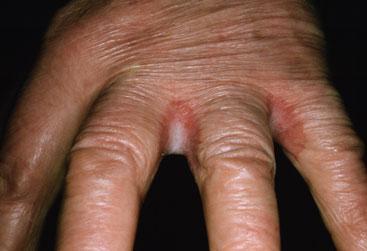 Usually affects one hand or, occasionally, both hands – but commonly presents with ‘one-hand, two-feet’ involvement, as it often occurs in patients with tinea pedis through scratching. The palmar surface is diffusely dry and hyperkeratotic. When the fingernails are involved, vesicles and scant scaling may be present.4 (http://www.pcds.org.uk/clinical-guidance/tinea-pedis-feet-manuum-hands-and-unguium-nails)