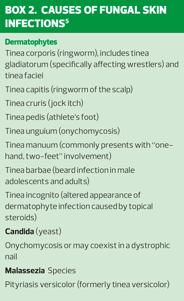 Dermatophytes are fungi that require keratin for growth. These fungi can cause superficial infections (tinea) of the skin, hair, and nails. Dermatophytes are spread by direct contact from other people (anthropophilic organisms), animals (zoophilic organisms), and soil (geophilic organisms), as well as indirectly from inanimate objects including upholstery, hairbrushes, hats.4 Dermatophytoses are known as tinea infections, which are further classified by the region of the body infected (Box 2).5 The classic appearance of a cutaneous tinea infection is a central clearing surrounded by an active border of redness and scaling, which gives rise to the more common name, ringworm, although a worm is not responsible and patients need reassurance that this is not the case. Tinea infections do not involve mucosa dermatophytes and only involve keratinized tissue. Tinea infections may be similar in appearance to many other skin conditions and are often misdiagnosed and, therefore, mistreated.2 There are three genera of dermatophytes – Trichophyton (T), Microsporum (M) and Epidermophyton (E). The most common organism in the UK is Trichophyton rubrum, except on the scalp where Trichophyton tonsurans and Microsporum canis predominate.6