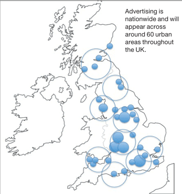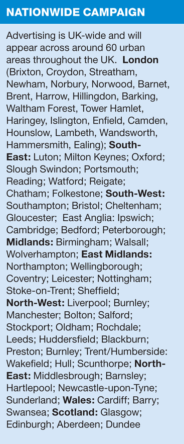 Advertising is UK wide and will appear across around 60 urban areas throughout the UK.