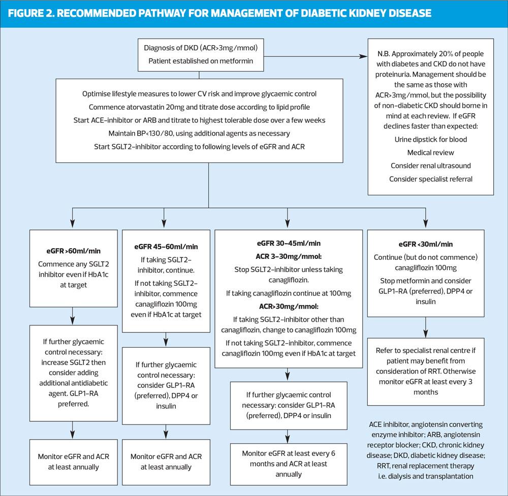 The growing body of evidence that SGLT2 inhibitors slow CKD progression and improve CV outcomes in patients with DKD led the American Diabetes Association (ADA) and European Association for the Study of Diabetes (EASD) to recommend in their consensus statement that an SGLT2 inhibitor (or glucagon-like peptide-1 receptor agonist [GLP-1 RA]) is the preferred option for patients who have DKD whose glycaemia is not controlled by metformin alone.10 This advice was updated in 2020 following publication of the CREDENCE trial, to recommend that people established on metformin who have either DKD or heart failure should be offered SGLT2-inhibitors in preference to other agents, independently of HbA1C.11