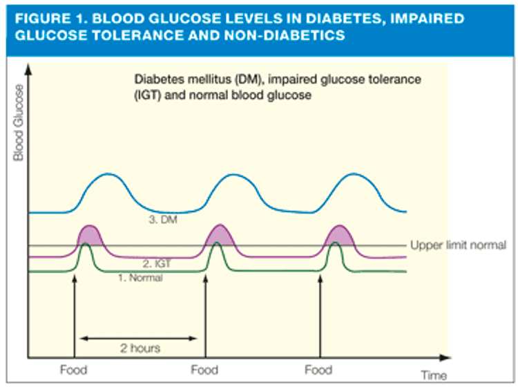 The middle wavy line represents impaired glucose tolerance. In these individuals the fasting blood sugar levels are still fine but the insulin bolus release, or sensitivity to it, or both, is impaired so the period of raise blood sugar after eating is extended and blood sugar levels may rise well into the diabetic 'zone'.