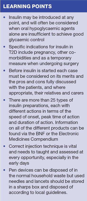 Before starting insulin, patients should be fully aware of the lifestyle implications. For example, they may need to pay closer attention to when and what they eat and the type and frequency of physical activity. They may not have been carrying out regular home blood glucose monitoring (HBGM) and need to understand that they are likely to need to do this from now on. They need to understand how to manage episodes of hyperglycaemia and hypoglycaemia and how to adjust their regimes accordingly. They also need to be aware of managing intercurrent illness – the so-called sick day rules.7 For these reasons you should allow at least an hour for the first appointment and plenty of time for subsequent appointments, with the opportunity for telephone contact in between.