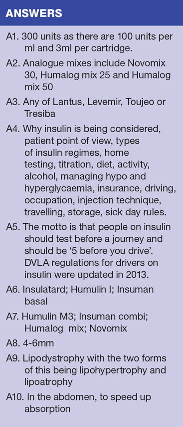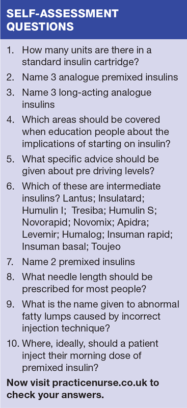 General practice nurses have a key role in helping people with type 2 diabetes manage their condition. Insulin initiation can, with training and assessment of competence, become another important role in helping patients optimise their long term outcomes and reduce the risk of complications. Read the article and then test your knowledge by completing the self-assessment questions. Then scroll down to check your answers.