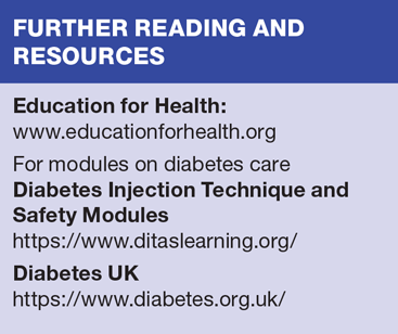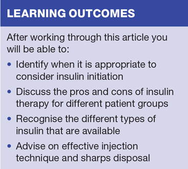 Correct injection technique is central to the effectiveness of insulin therapy and should be taught, assessed and monitored throughout the patient’s life. All GPNs have a role to play in supporting people on insulin at the start of treatment and beyond. However, insulin therapy is a high risk area in terms of the potential for errors so GPNs should be trained and competent to work in this area.