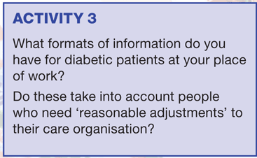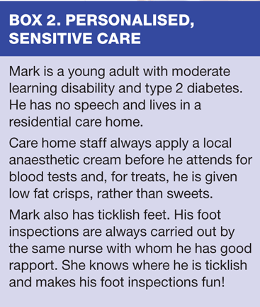 More people with learning disability are living longer and the incidence of co-morbidity, including diabetes, in this group is rising. It is therefore important to be proactive in identifying signs and symptoms in these individuals that might indicate the need for diagnostic testing. Those who develop diabetes will require care that is sensitively organised to support their special needs. Box 2 provides a 'real-life' example of such care. Good communication is essential to form a bond of trust that facilitates patient inclusion and involvement, and legislation is already in place to drive this forward.