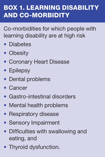 In comparison with the general population people with learning disability have a shorter life expectancy. While life expectancy has increased in recent years, the mortality of people with moderate to severe learning disabilities remains three times higher than in the general population.2 People with learning disabilities have a high risk of a large number of other morbidities.3 (Box 1) They also have a higher risk of developing dementia compared with the general population. This risk is significantly greater for people with Down's syndrome and will manifest at a much earlier age.4,5