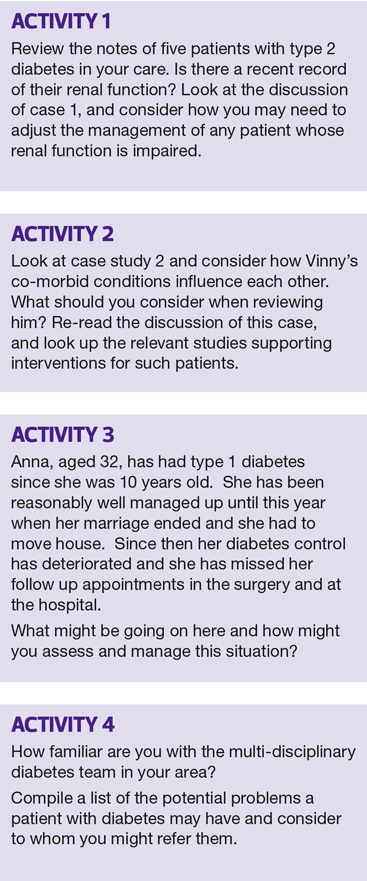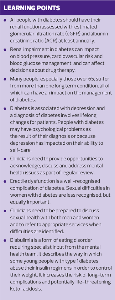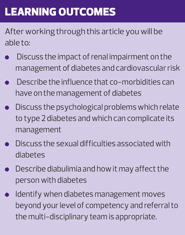 Diabetes management can be complicated by renal impairment, cardiovascular risk, co-morbidities, psychological problems, sexual difficulties, diabulimia and other issues. GPNs should understand the need to recognise these problems and ensure that patients get the support that they need. This includes knowing when to refer on for specialist support from the multi-disciplinary team.