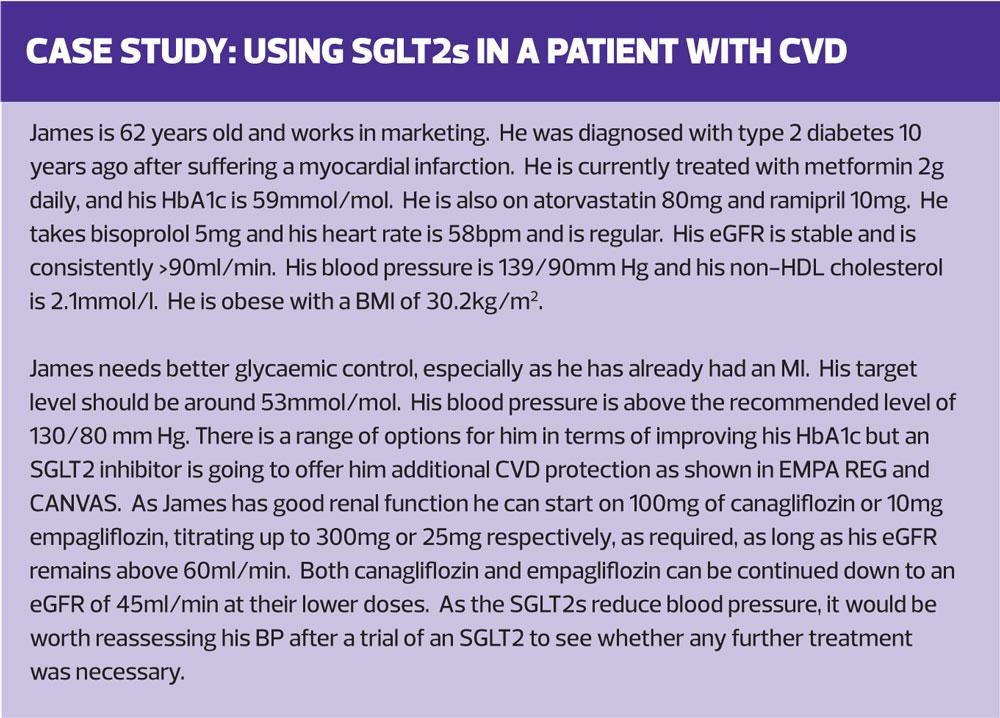 Diabetes has, for some time, been recognised as condition that has a high risk of causing cardiovascular complications.3 Thirty years ago, in 1998, Haffner et al published a paper which suggested that having diabetes led to the same risk equivalence of a future myocardial infarction as someone who had already had one.3 However, it is not just the heart that is affected by diabetes. End stage renal disease, leading to dialysis and significant mortality levels, is higher in people living with diabetes compared to those without diabetes.4 At a time when 10% of the total NHS budget is spent on diabetes, it is sobering to consider that most of that – around 80% in fact – is spent on treating the complications of the disease, not the disease itself.5 When there are pressures on the NHS to save money, it would appear that the greatest savings can be made by reducing complication rates, rather than through the prescribing budget. It is not surprising, then, that the recently published Scottish Intercollegiate Guidelines Network (SIGN) guideline on the management of T2D highlighted the importance of considering the use of the sodium-glucose cotransporter 2 (SGLT2) inhibitors canagliflozin and empagliflozin due to their proven cardiovascular benefits.6 These benefits were demonstrated in two ground-breaking trials examining the impact of these SGLT2 inhibitors. The Empagliflozin, Cardiovascular Outcomes, and Mortality in Type 2 Diabetes (EMPA-REG) study compared empagliflozin with placebo in patients with increased CVD risk.7 The Canagliflozin Cardiovascular Assessment Study (CANVAS) studied the impact of canagliflozin on individuals with T2D who were at high risk of, or with a history of, CVD.8 The results of the DECLARE study, which studied the impact of dapagliflozin on CVD risk, are due to be presented at the American Heart Association Scientific Sessions meeting next month (November 2018).9,10