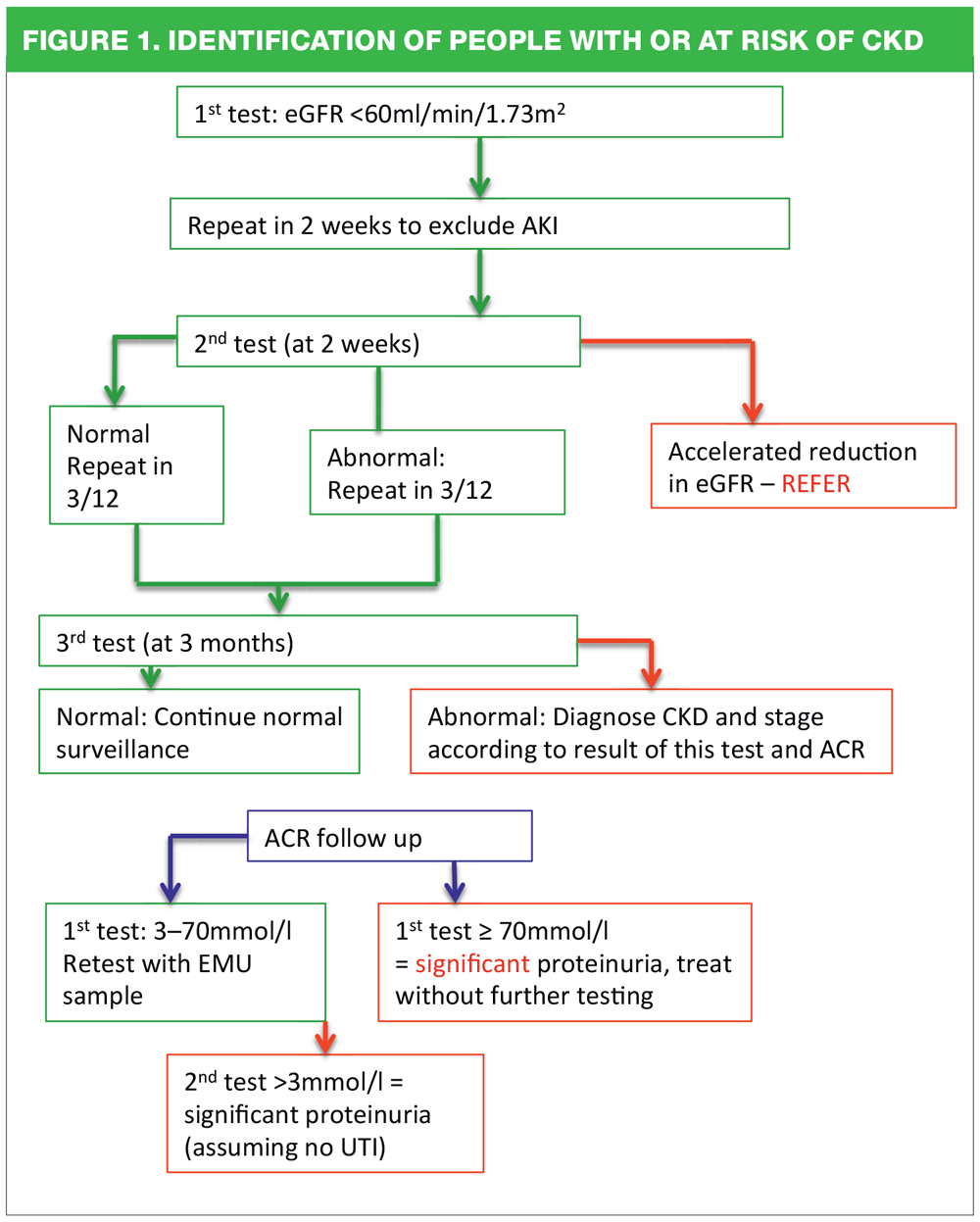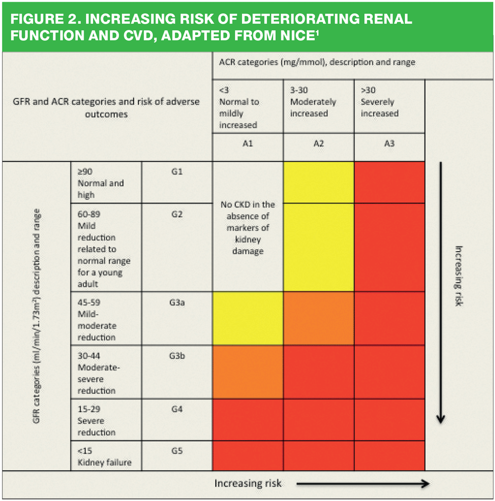 The diagnosis of renal impairment is made on the basis of abnormal blood and/or urine tests. A blood test can identify the estimated glomerular filtration rate (eGFR) and this, along with a urine test that measures the albumin creatinine ratio (ACR) can help to identify people with or at risk of chronic kidney disease (CKD) (Figure 1). Figure 2 explains how the results of each test are combined to give an indication of the increasing risk of both deteriorating renal function and CVD.