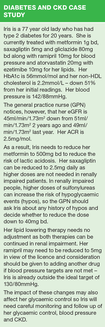 In summary, people with diabetes are at increased risk of CKD when compared with the general population. The combination of diabetes, hypertension and CKD increases the potential for people to develop CVD and/or end stage renal disease. Blood pressure control using angiotensin blocking agents (ACE inhibitors and ARBs) and other blood pressure and lipid lowering therapies as required will help to protect people with diabetes from both of these complications. Lifestyle interventions will offer additional benefit and improve risk reduction. In people with CKD, care should be taken when initiating, intensifying or adjusting medication, specifically those used to reduce blood glucose levels as licenses vary even within drug classes.