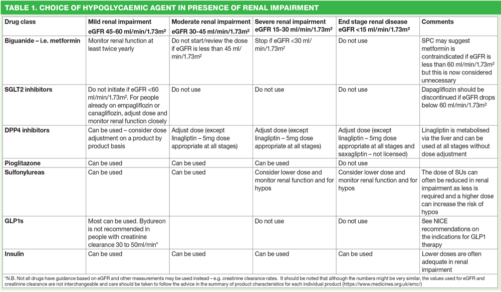 NICE guidelines for managing T2D recommend a strategy for blood glucose control which focuses on the use of metformin first line, followed by a choice of SGLT2 inhibitors, DPP4 inhibitors or pioglitazone at first intensification.4 If a combination of two drugs does not achieve adequate blood glucose control then a third agent should be added, which NICE suggests could be a sulfonylurea. NICE states that injectables may be added if control has not been achieved with three oral hypoglycaemic agents although they may be initiated at any stage of the process as indeed can insulin. Good control is defined as an HbA1c of 53mmol/mol albeit this should be tailored to each individual and may sit anywhere between 48 and 58mmol/mol.4 Renal impairment will have a significant impact on the choice of hypoglycaemic agent as shown in Table 1.