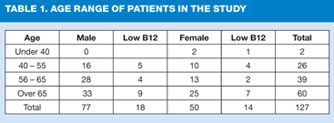 Of the patients screened, 32 (25.19%) were found to have a low B12. (Tables 3 - 6)