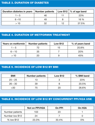 The number of low B12 results found in this small group is consistent with previous findings, and suggests it may be beneficial to screen for this deficiency in patients with diabetes taking metformin, as part of routine management. In the elderly population, studies have found low B12 rates of 10 to 14%, 3,4 but in this study across an age range of 36 to 91 years the prevalence of low B12 was 25.19%. There are, of course, cost implications in carrying out the B12 tests, but if all patients on metformin were offered B12 supplementation instead of screening, there would be both cost and ethical considerations, since some patients would be taking a medication they did not need.