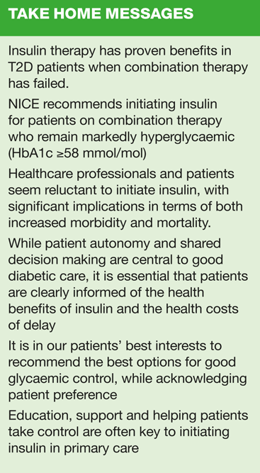 Times have changed from the days when insulin was started only in hospital, and then only after holding out without it for as long as possible. Insulin is an important part of good care of type 2 diabetes. There are many other therapies to choose from, many of which can be used before moving to insulin and some of which have advantages over it. However insulin is now commonly started in general practice and the choice of insulins, devices and needles is vastly improved. This means there is now a level of control and comfort associated with insulin that is better than anything we have ever had before. On top of this our understanding of the benefits that insulin therapy can bring is also enhanced, and that places the responsibility squarely with us as healthcare professionals to offer patients appropriate guidance, advice and support in making their choices with us. It is not enough simply to opt out and say the patient doesn't want insulin just yet. The evidence is that this is what we have been doing, and we need to be far clearer in terms of what is best for patients and advise accordingly.