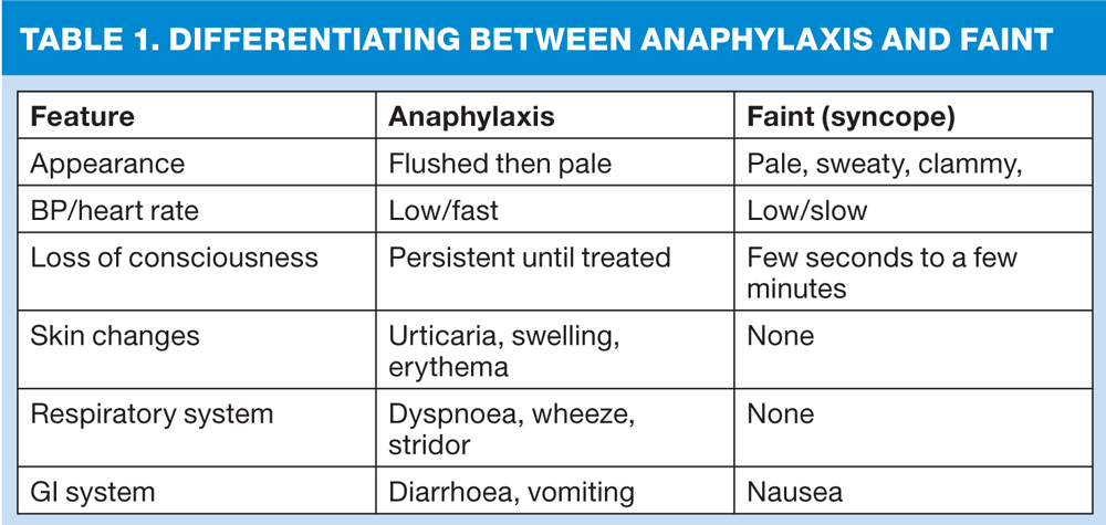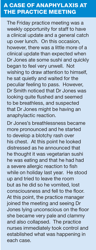 It can sometimes be unclear initially if a patient is sufffering from an anaphylactic reaction or has simply fainted. In Dr Jones's case, he had become unwell within minutes of eating sushi and the history of previous allergic reaction to fish and the presentation of facial flushing, urticarial, dyspnoea and collapse soon after exposure to an allergen would be compatible with anaphylaxis. However, the case of the practice manager was slightly different — she had signs and symptoms that were more compatible with a faint, such as pallor and sweating after exposure to emotional distress and she would require completely different management.