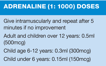 The patient can be cared for in the most comfortable position for them. If breathing is impaired sitting upright may help; low blood pressure and collapse may be better addressed by having the patient lying flat, possibly with legs elevated. Dr Jones's attempt to leave the room could have had disastrous consequences as standing during anaphylaxis may be linked to an increased risk of cardiac arrest.4 The most important intervention at this stage is to give adrenaline (epinephrine) intramuscularly as soon as possible. [See box for dosage] If there is any doubt about the diagnosis but anaphylaxis is suspected, adrenaline should be administered without delay as there is potentially more harm from not giving adrenaline in a person who is having an anaphylactic reaction than giving a dose of adrenaline to someone who is not. Anaphylaxis can be fatal so immediate assessment of the patient's airway, breathing and circulation should be carried out and a 999 call should be made, stating that the patient is having an anaphylactic reaction. Life support should be carried out as necessary.5 If possible and practical, blood pressure, pulse oximetry and ECG can all be monitored.