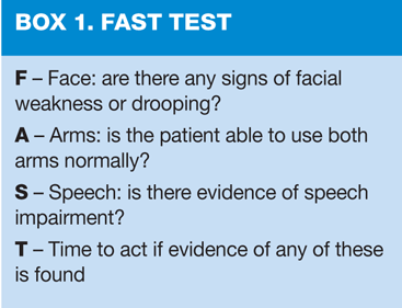 The National Institute for Health and Clinical Excellence4 recommends using a validated tool such as the FAST test (Box 1) to assess stroke risk in the community setting and a campaign aimed at increasing public awareness of this test was also developed. According to the Royal College of Physicians (RCP), 95% of strokes occur outside hospital.3 The FAST test is quick and easy to initiate and allows the symptoms of possible stroke to be identified and acted upon swiftly, thus reducing the risk of death and disability.