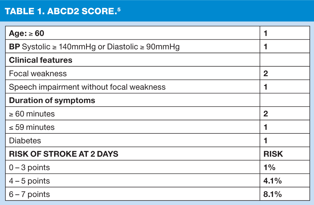 One of the most common causes of thrombotic stroke due to clots is atrial fibrillation (AF). AF is the most common cardiac arrhythmia and is due to an electrical fault within the heart which leads to a disordered beat in the heart chambers. As a result of this disordered beat, the ventricles do not eject the blood within them in the normal way and this allows tiny clots to form. These clots may then be pushed out into the narrowed carotid artery, impeding blood flow to the brain. Because of this chain of events, people with AF should be assessed for their stroke risk using a recognised tool such as the ABCD2 score (Table 1), or the CHADS2 or CHA2DS2VASc scoring systems. Information on these two tools can be accessed at http://www.gpnotebook.co.uk/simplepage.cfm?ID=x20110126111352933383