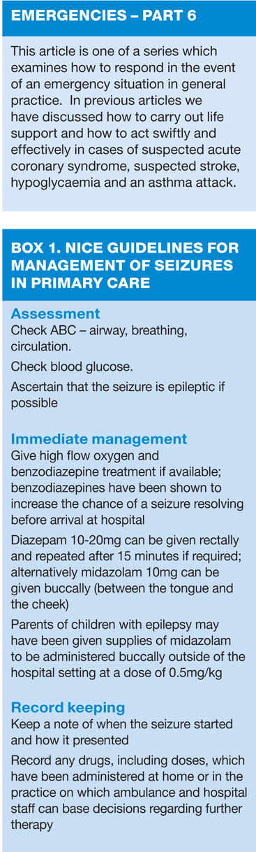 Witnessing a seizure in the surgery or in a public place can be an unnerving experience, but knowing how to respond can help prevent a 'fit' progressing into life-threatening status epilepticus. In this article, we will discuss immediate management of the patient presenting with a seizure or in status epilepticus, and provide an overview of diagnosis, management and the current approach to treatment of epilepsy