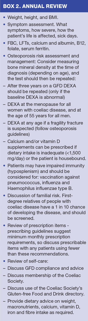 Management consists of excluding dietary intake of gluten. Commencement of a gluten-free diet (GFD) produces rapid symptomatic improvement and, on biopsy, the intestinal mucosa returns to normal over the same timescale.1 There is no good evidence about what levels of gluten can be safely ingested without triggering symptoms, so affected patients should usually endeavour to avoid all gluten.3,4