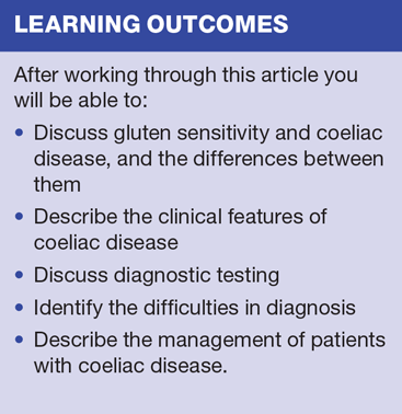 There are several forms of gluten intolerance but not all of them are coeliac disease, a specific auto-immune response to gluten that can have a profound impact on the patient's physical health and quality of life. We discuss the diagnosis of this condition and the role of the practice nurse in its management
