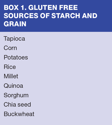 Gluten is only found in starch-containing foods, such as bread, derived from modified grasses. Fruit, meat, vegetables and fish are gluten free. The diet therefore consists of no wheat, barley or rye. Moderate quantities of oats are tolerated by most patients, although some also show sensitivity to oats. British Society of Gastroenterology (BSG) guidelines suggest oats are excluded for 12 months while patients get used to a GFD but can then be cautiously introduced. Box 1 lists sources of starch which do not contain gluten.5