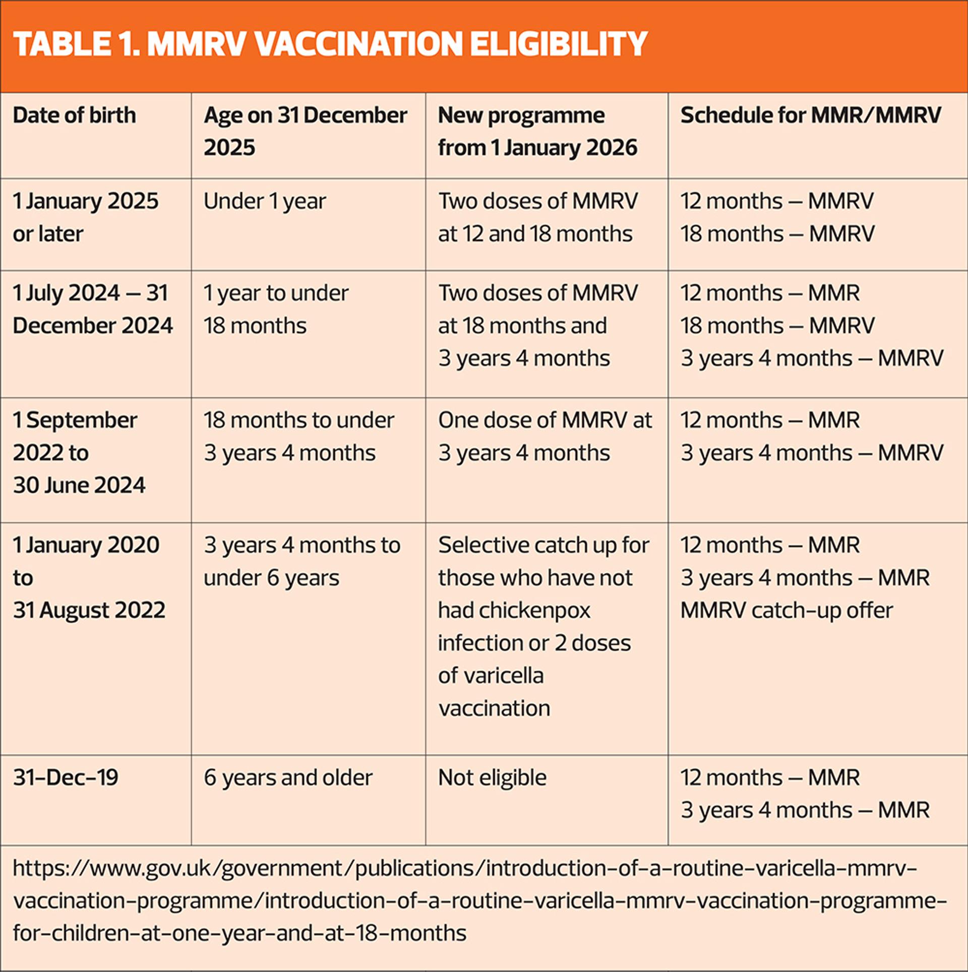 Children born after 1 January 2020 who need to catch up on MMR should have the MMRV vaccination.30 The incomplete immunisation schedule is currently being updated to reflect these changes. Those involved in the vaccinating must ensure they receive training on any new vaccine, and the UKHSA is running a webinar on these changes on 3 December, 14:15–15:00 hours – register at https://www.integratedcaresupport.com/event-details-registration/ukhsa-webinar-upcoming-changes-to-the-routine-childhood-immunisation-schedule (https://www.integratedcaresupport.com/event-details-registration/ukhsa-webinar-upcoming-changes-to-the-routine-childhood-immunisation-schedule).