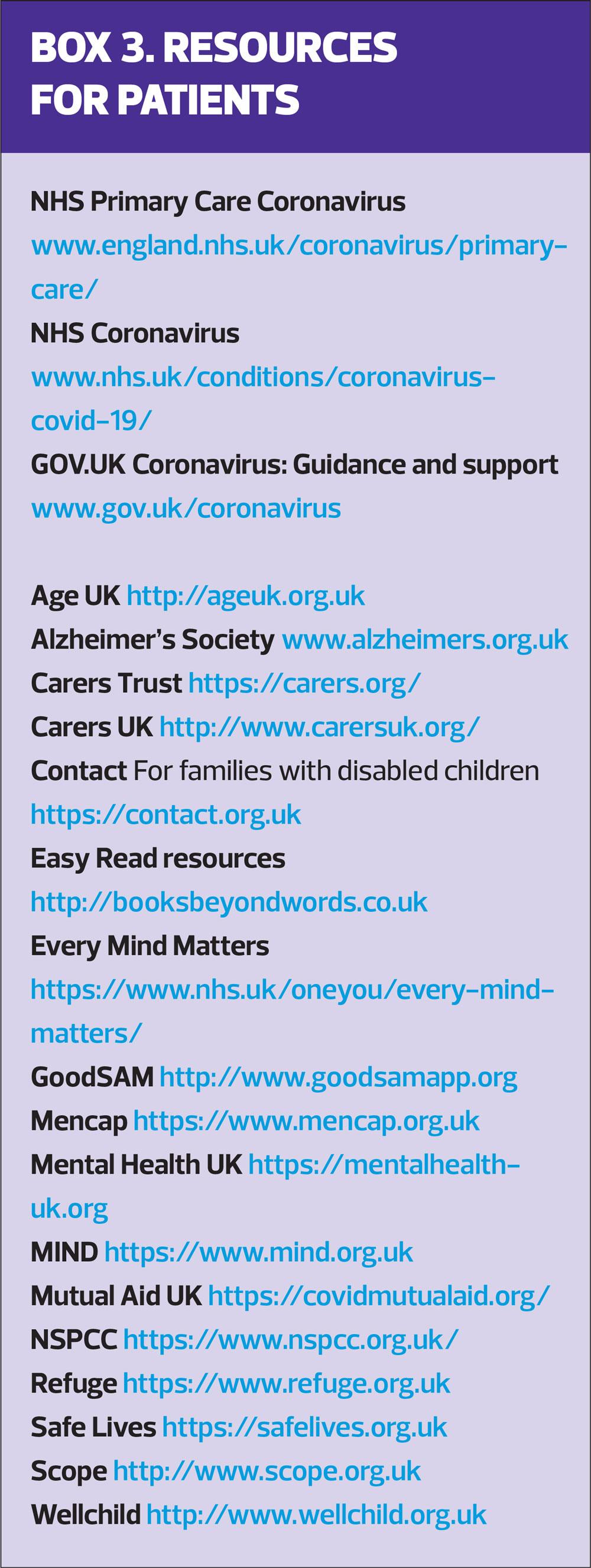 There is a wealth of official guidance for patients who are shielding, including advice on accessing food and medicines, living safely with other people, making plans and back-up plans for essential carers as well as advice about looking after emotional wellbeing, keeping physically active and staying connected with family and friends (Box 3).4 We should be contacting these vulnerable patients, by phone or video link, checking they understand what shielding means and how it relates to their personal circumstances, ensuring they can access their medications and address any urgent or ongoing health needs or concerns they have. They may need signposting to local community volunteers or good neighbourhood schemes, to the NHS Voluntary Responders Programme or social prescribing link workers.