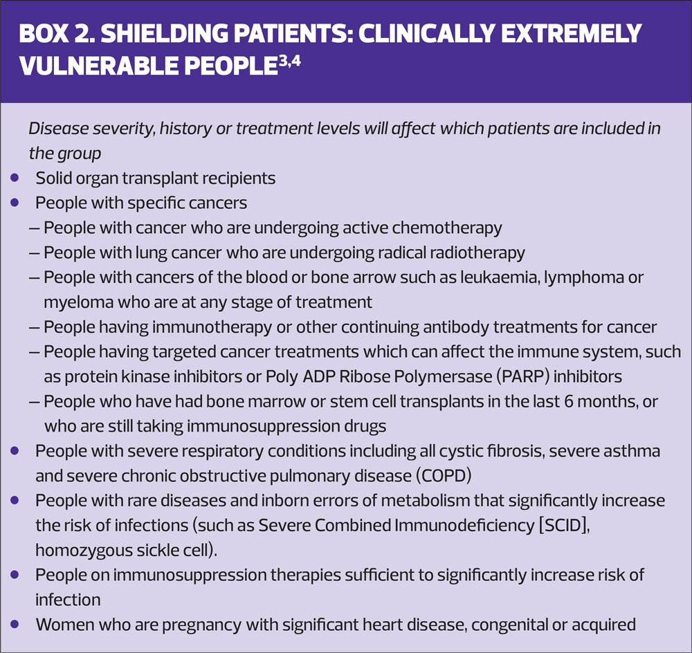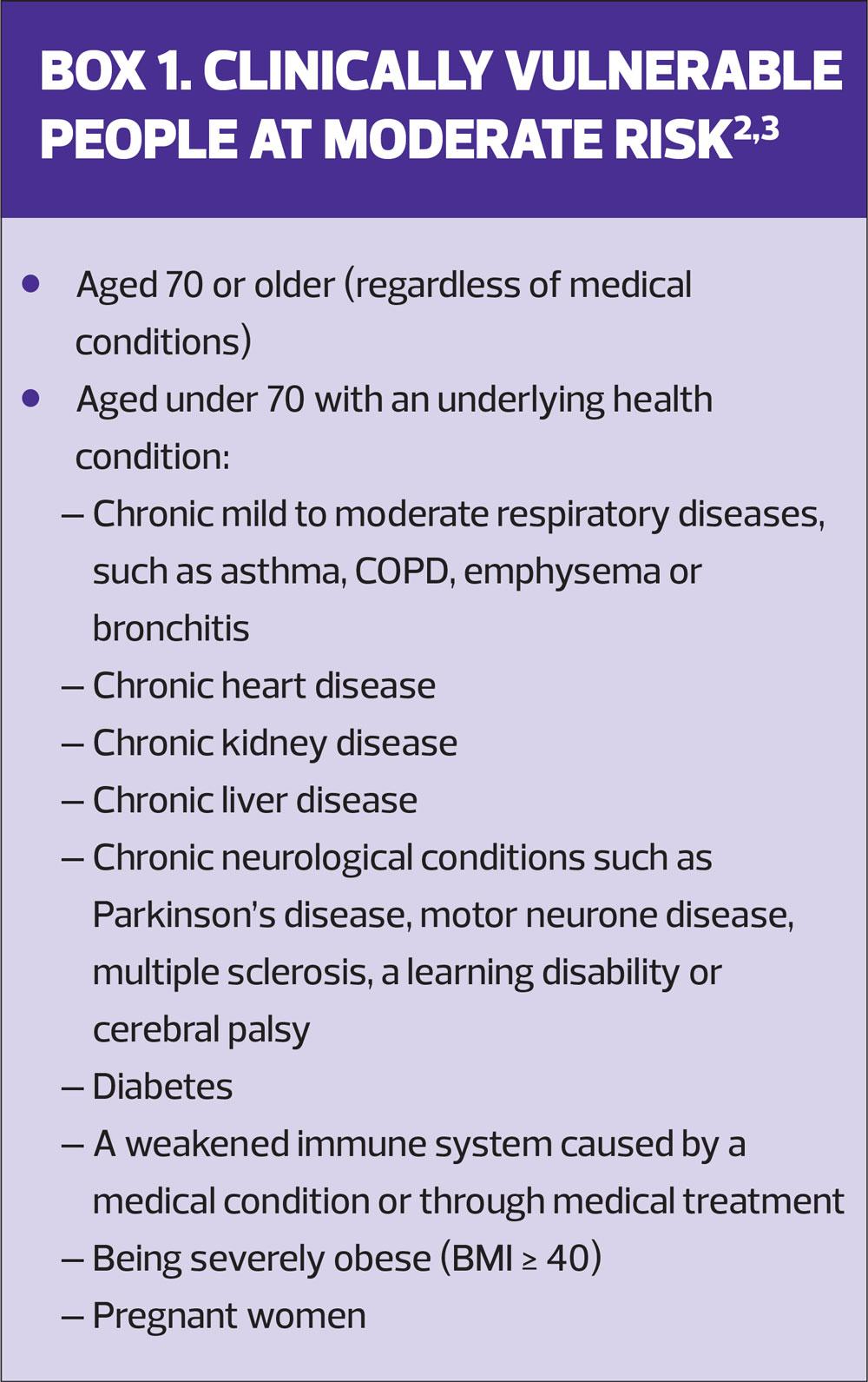 Above all, it is vital that our vulnerable and at risk patients keep safe during this pandemic and avoid risk of infection. We know that COVID-19 has the ability to spread rapidly and extensively.1 We know that the severity of the infection, and risk of critical illness and death, is greater in older patients and those with existing medical conditions but especially those who are clinically extremely vulnerable (Boxes 1 and 2).2-4 Clearly we all have a personal responsibility to reduce our risks of contact and spread of the virus but it is also our professional duty to ensure that our patients, many of whom are extremely vulnerable, are provided with necessary care appropriately and safely.