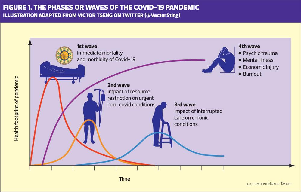 Nationally and regionally the focus has been on patient safety, ensuring patients receive the best possible care, support and advice. The challenge has been managing demand by balancing workload and workforce, including recruiting GP and nurse returners. The aim was to try and reduce the demand on hospitals to enable them to manage the increased capacity created by COVID-19. In a recent Tweet by Canadian doctor, Victor Tseng, this is referred to as stage 1 of the COVID-19 pandemic, illustrated in Figure 1.