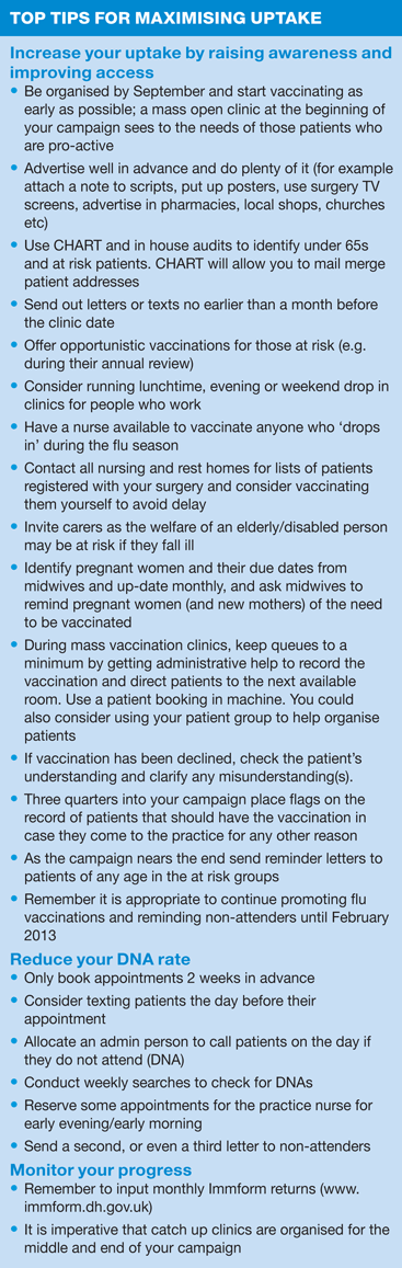 The DH is encouraging practices to look at their own uptake for previous years, and recommends that each GP practice has a named individual who is responsible for the flu vaccination programme, and has a register that can identify all pregnant women, patients under the age of 65 years at risk groups and aged 65 years and over. The flu lead in each practice could send out a monthly uptake report to all clinicians, and to encourage practice teams to reach targets, a practice incentive could be offered.