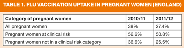 Early uptake of H1N1 vaccine by pregnant women was extremely poor due to healthcare providers either not offering, or actually advising against, vaccination, and also to many women's concerns over vaccine safety. Rates in 2010-2011 were 36.6%, still far below recommended levels of 60%.6 Hence, there is still a clear need to promote the benefits of seasonal flu vaccine, not only to the women themselves, but also to healthcare professionals.4