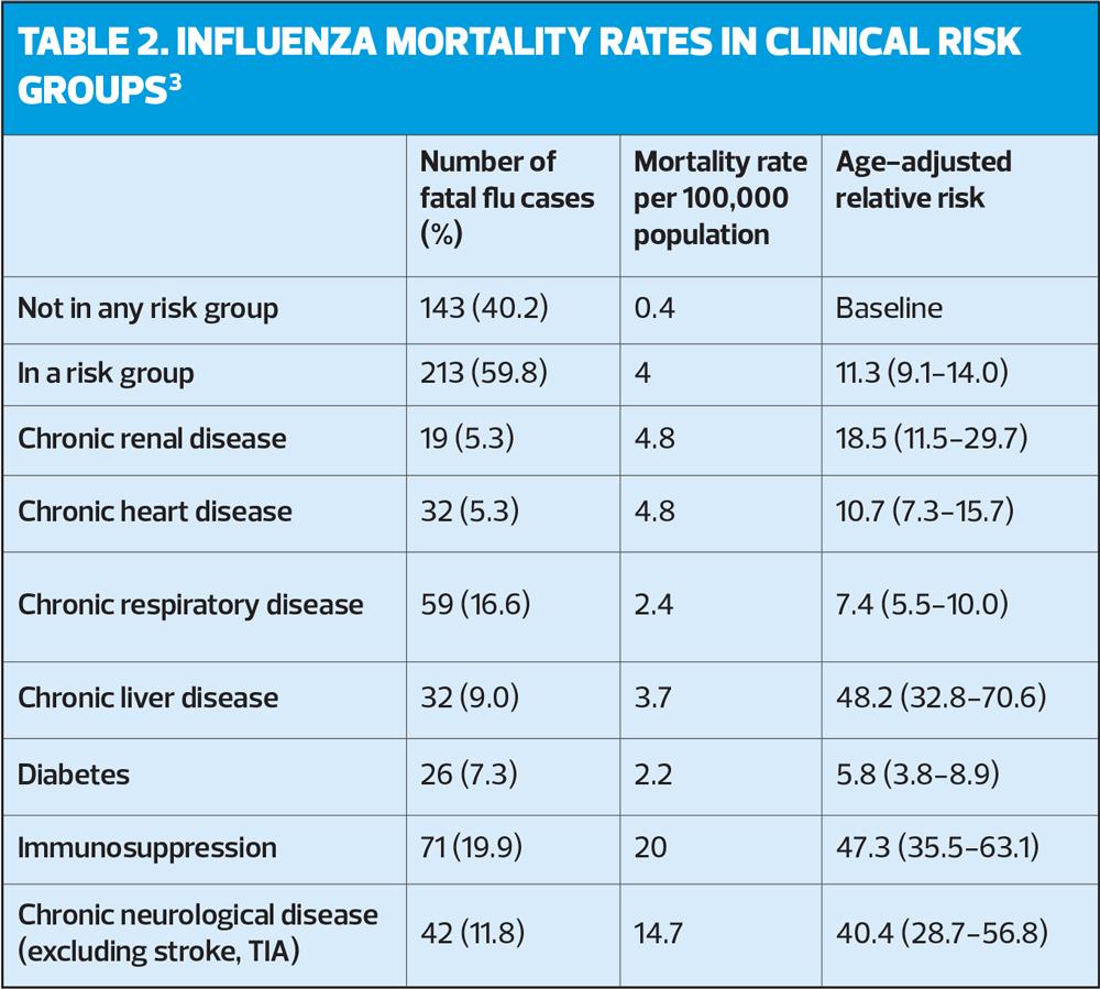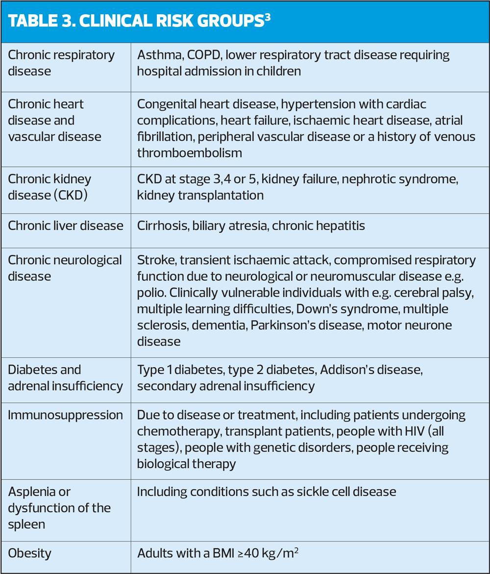Historically, uptake in patients in clinical risk groups has fallen far short of that in the over-65s, as seen in Table 1.3 This is despite the markedly increased mortality rates among those with chronic diseases, including asthma, COPD, heart disease and diabetes (Table 2). As an aide-memoire, the full list of risk groups is given in Table 3.