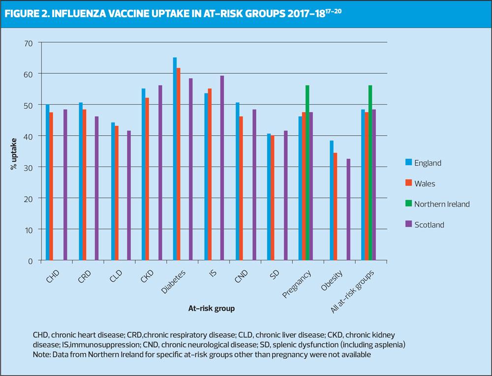 For instance, influenza vaccination uptake in the chronic heart disease, chronic respiratory disease, chronic liver disease, chronic neurological disease and asplenia or dysfunction of the spleen at-risk groups has been <50% since 2015-2016 in England and Wales.