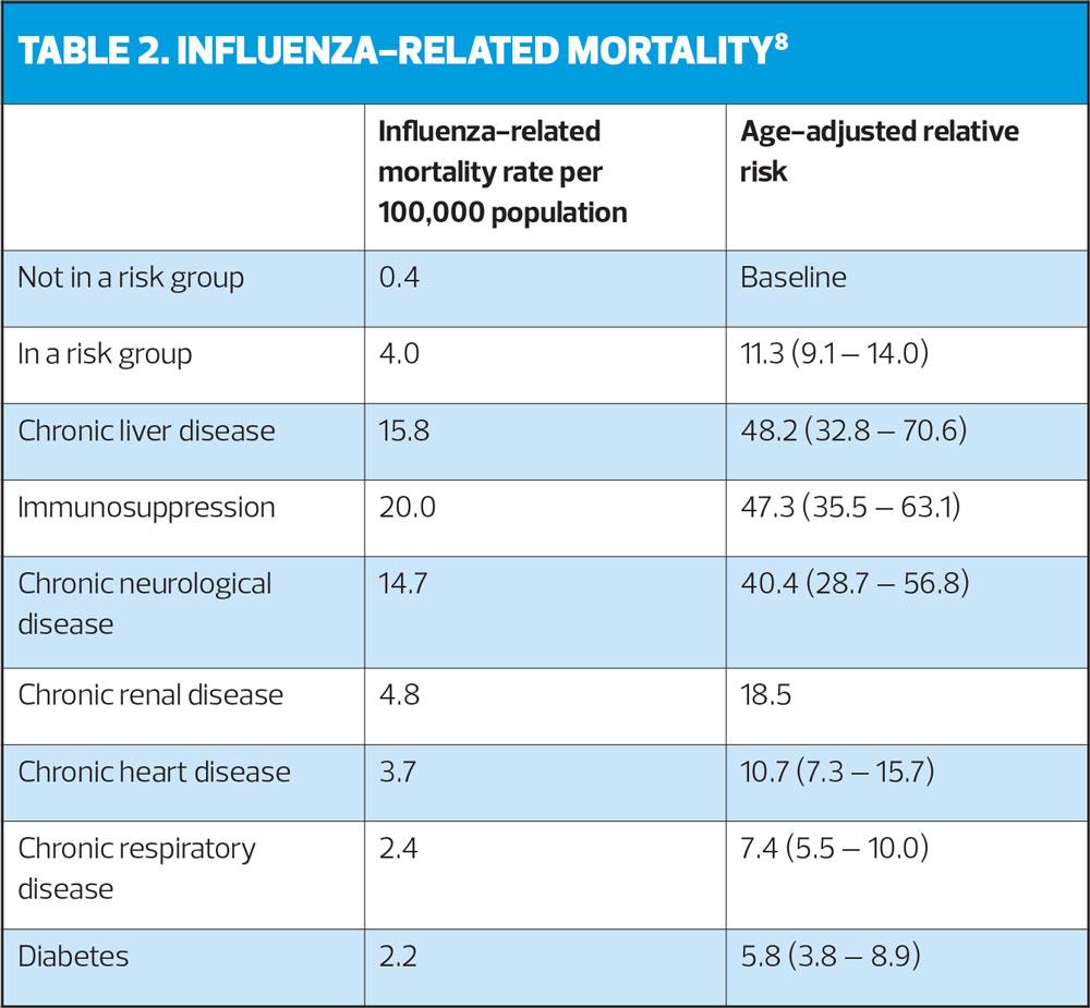 Further evidence highlighting the potential issues facing at-risk individuals is shown in Table 2, which shows influenza-related mortality rates (September 2010-May 2011 data). The last major flu outbreak was in 2009-10, when – although there were only 500 laboratory-confirmed deaths, mortality rates were highest in those with chronic neurological disease, respiratory disease and immunosuppression. People with morbid obesity (BMI>40) were also at higher risk of hospitalisation and/or death).8