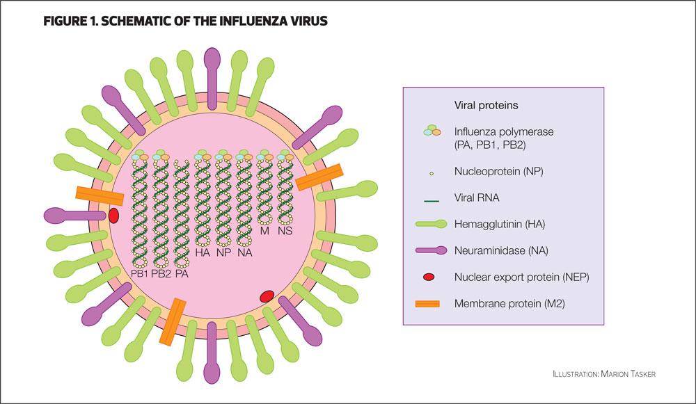Influenza is an RNA virus of the orthomyxovirus family. The virus usually demonstrates a spherical shape, though filamentous forms have been observed. The RNA is segmented into eight pieces. The surface of the virus has two key proteins, haemagglutinin (H) and neuraminidase (N), which are required for viral cell attachment and entry.