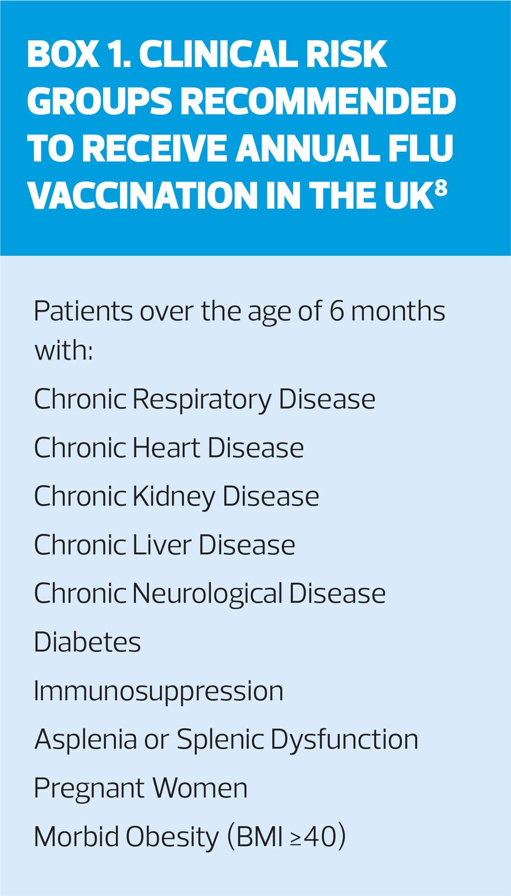 People who fall into one or more of these groups (Box 1)8 can suffer exacerbations of the symptoms listed above, the underlying reason being that such individuals will likely have a degree of immuno-incompetence. Influenza vaccination was originally introduced to some of these groups in the 1960s as they were found to be at higher risk of influenza-associated morbidity and mortality. Subsequent programme modifications added those above 65 years of age (in 2000), pregnant women (in 2010) and the morbidly obese (BMI≥40kg/m2) (in 2014): groups for inclusion to ‘at-risk’ are reviewed annually by the Joint Committee on Vaccination and Immunisation (JCVI).