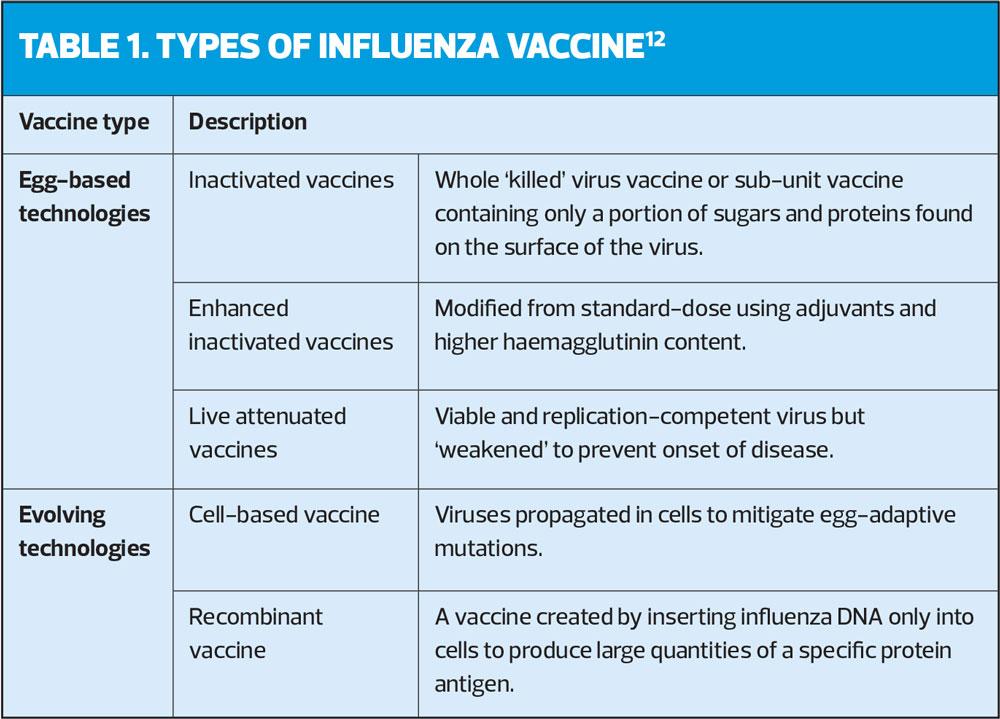 Vaccination is the most effective means of protection against influenza infection.1 However, clinicians, researchers and manufacturers are all faced with the same complex challenge to address the high variability and rapid mutation rate of influenza. In this review, we aim to provide an overview of influenza vaccine technology, explore evolving vaccine technologies and understand the impact of these changes on clinical practice.