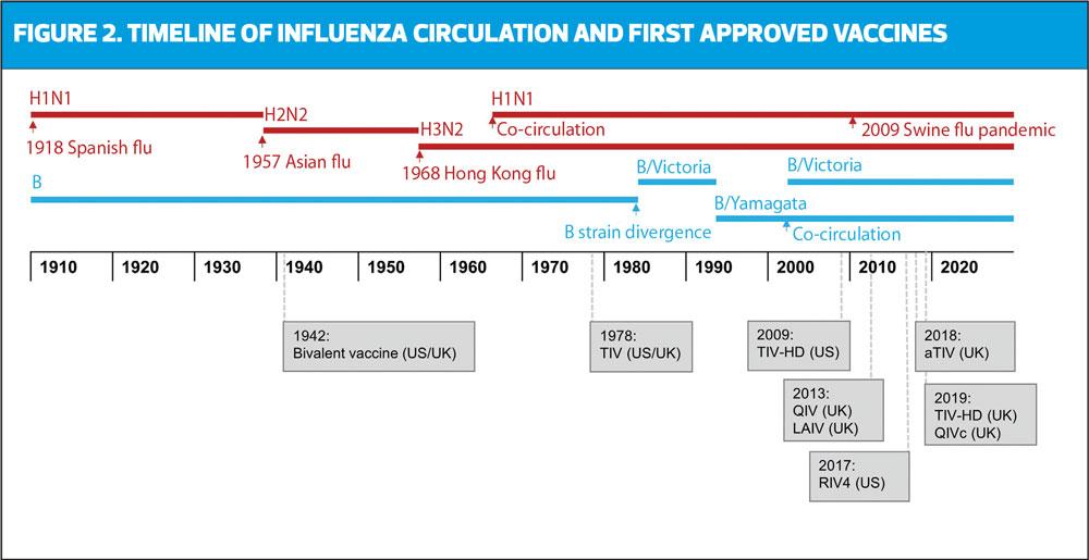 Historically, influenza A strains circulated alternately in humans, and it was not until 1940 that Influenza B was discovered and a bivalent vaccine was developed (Figure 2).13 By 1970, the B strain lineage diverged into two lineages (B/Victoria and B/Yamagata), further impacting the accuracy of vaccine matching. Following the re-emergence and co-circulation of A/H1N1 with A/H3N2 in 1978,14 the first trivalent influenza vaccine (TIV) was developed, containing two haemagglutinin (HA) antigens derived from each of the influenza A strains and one influenza B strain.15 The co-circulation of both B strains occurred in the early 2000s when the B/Victoria lineage reappeared for the first time in 10 years.16 Since TIV may not offer effective cross-protection for the alternate circulating B strain, there was a potential for suboptimal protection during mismatched seasons. This was particularly evident in the 2017/18 season, where UK influenza-associated deaths almost tripled due to the early circulation of influenza in the community, and TIV mismatch against B/Yamagata.17,18 As a result, a quadrivalent influenza vaccine (QIV) was introduced to protect against both B lineages, and is now widely offered to eligible groups in the UK from ages 6 months onwards.19