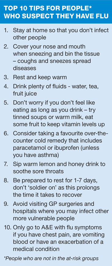 Flu (influenza) is an acute viral infection, characterised by all or some of the following: fever, chills, headache, sore throat, muscle and or joint aches and pains and tiredness. The symptoms develop fairly quickly and can be really unpleasant. It is a self-limiting disease in healthy individuals and recovery is usual in two to seven days. It is a good idea to educate people to recognise these 'normal' symptoms and to suggest the top ten tips for self care so that they can look after themselves at home.