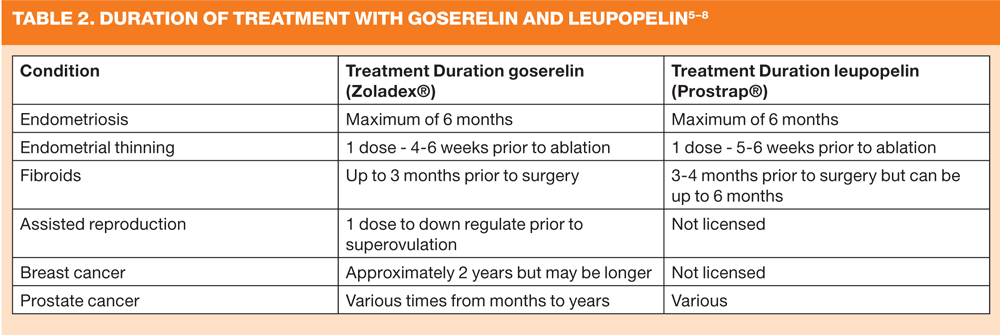 Goserelin 3.6mg, given every 28 days, may be used for all conditions for which it is indicated, and the 10.8mg dose,given every three months, is reserved for male patients only.