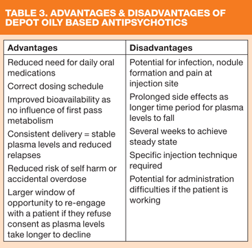 These antipsychotic medications are used in the treatment of schizophrenia and other psychotic illnesses that are thought to be caused by the over activity of dopamine in the brain, and work by blocking the dopamine receptors. Risperidone, a second generation LAI also has the benefit of affecting the neurotransmitter serotonin, thus also relieving the negative symptoms of schizophrenia such as lack of emotion and social withdrawal. The advantages and disadvantages of depot antipsychotic drug administration are shown in Table 3.