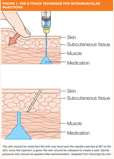 Consideration should be given to the length of the needle used to allow administration of the medication into the muscle. Nisbet14 suggests a 35mm needle may not be long enough to reach muscle, especially in females who have a deeper fat layer at the dorsogluteal site. Prior to administration, it is essential to ensure (by aspiration) that intravascular administration does not take place.
