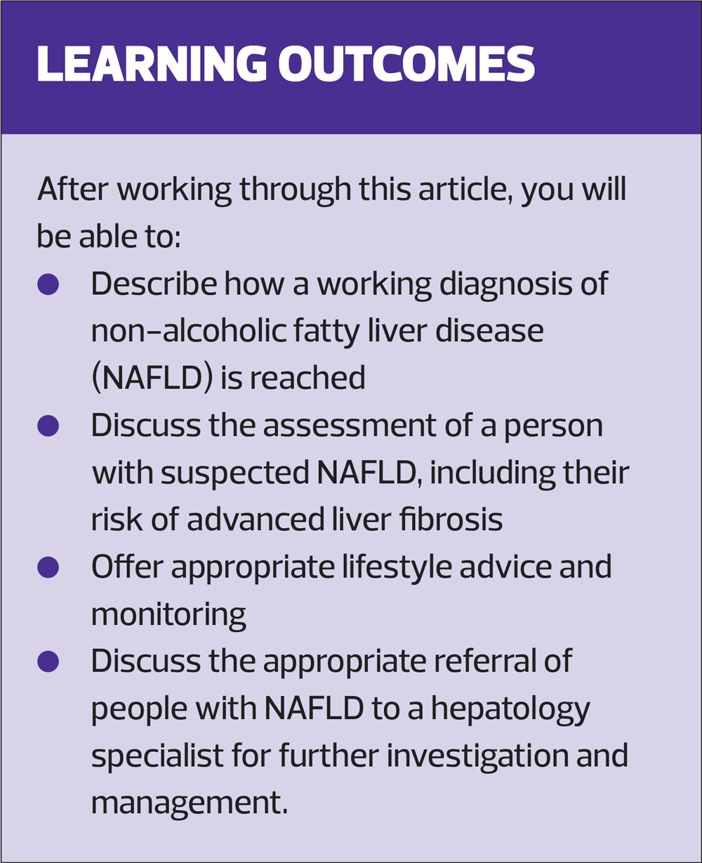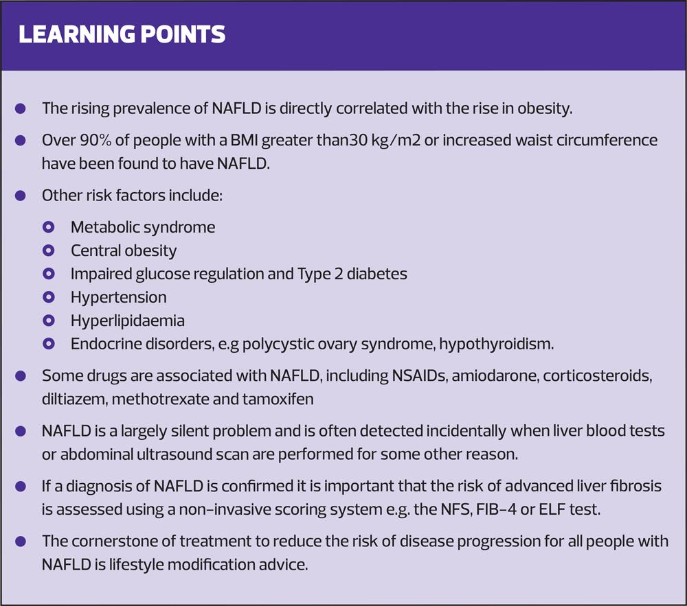 Given the rising and often hidden problem that is NAFLD it is crucially important, when it is diagnosed, that successful interventions are put in place. General practice nurses can have a pivotal role in the management of people with NAFLD as they are usually also managing those most at risk, including people with diabetes, hypertension, and metabolic syndrome.