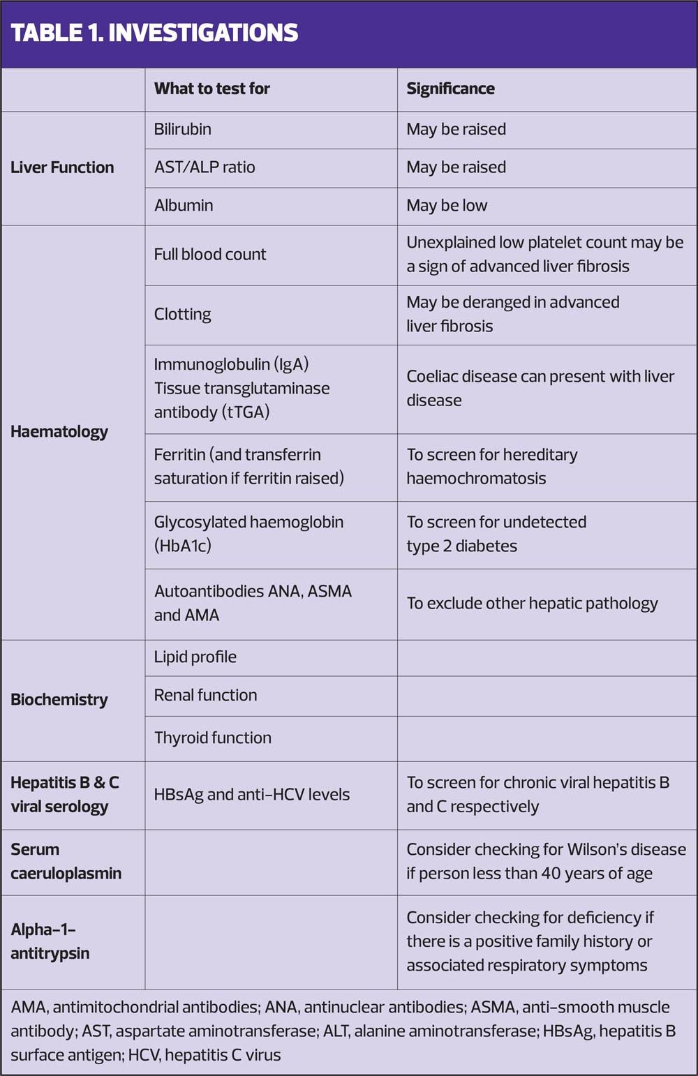 Specialist investigations may include transient elastography (fibroscan) and liver biopsy.11,12 Fibrotic livers have reduced elasticity, and transient elastography is a non-invasive test which measures liver stiffness, which correlates with the degree of liver fibrosis.