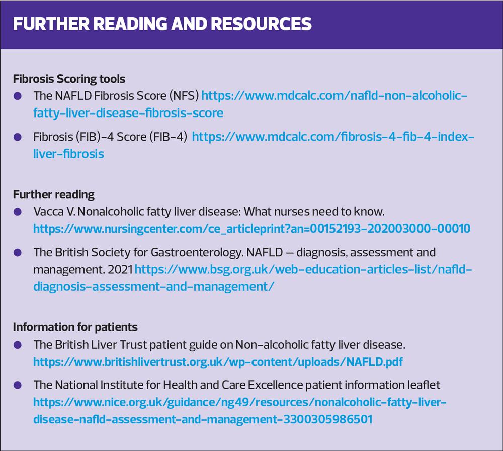 In addition patients also benefit from advice on sources of information and support for people with NAFLD. (See Resources and Further Reading.)